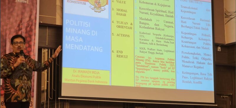Dalam paparannya, Dr. Iramady Irdja memaparkan pandangan mendalam tentang karakteristik politisi Minang ideal yang ia sebut sebagai “politisi putih”, yakni mereka yang berlandaskan filosofi ABS-SBK (Adat Basandi Syarak, Syarak Basandi Kitabullah) dengan akhlak mulia, kejujuran, dan kebenaran.