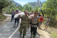Tidak hanya memimpin, Wabup Risnaldi dan Kapolres AKBP Derry Indra bahkan menyandang langsung paket bantuan, ikut memikul dan mengangkut logistik menuju titik terdampak yang sulit dijangkau